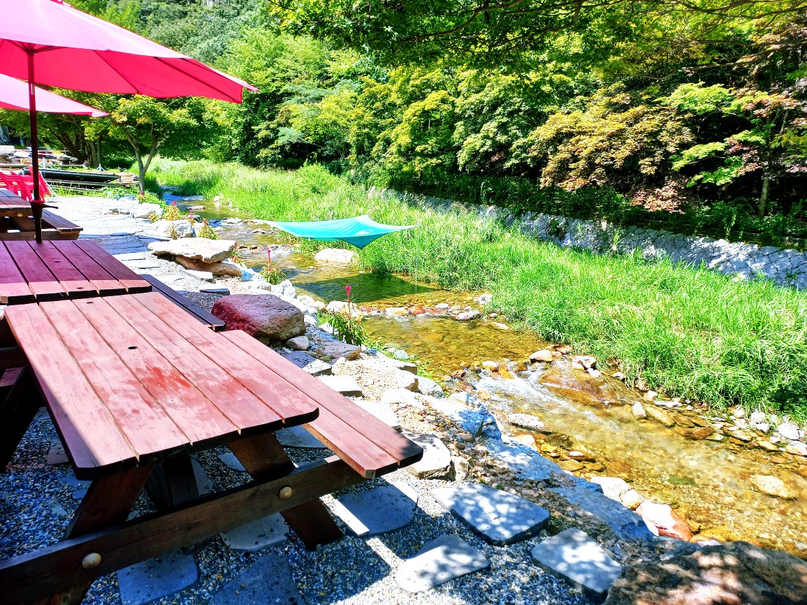 전북 순창 강천산 공원매표소 입구에 위치한 이도펜션 펜션이 계곡과 접해 있고 원목테이블이 충분히 마련되어 있습니다. 물이 깊지 않아 영유아부터 어르신들까지 물놀이가 가능합니다.